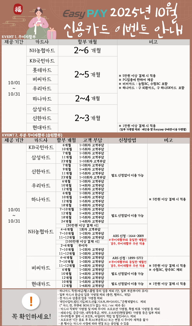 공지 2025년 10월 신용카드 무이자 및 부분 무이자 이벤트 안내